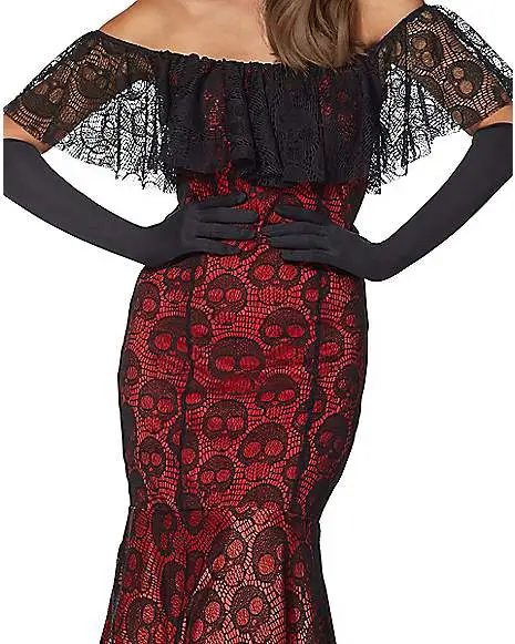 Itβs time to celebrate with this festive Day of the Dead dress costume. Its beautifully put-together red and black design will have you dancing the night away!